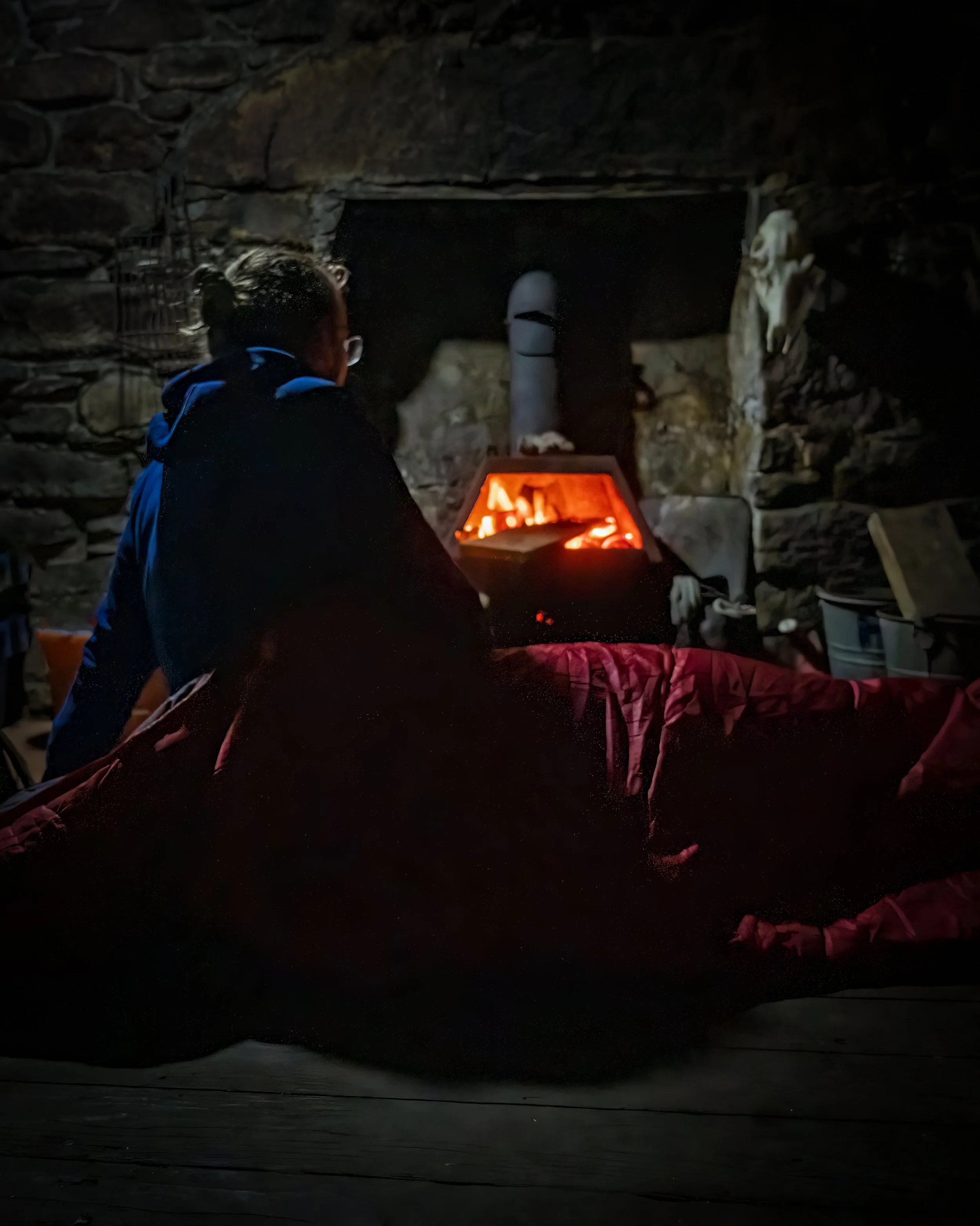 I rolled my sleeping bag out on the floor by the fire. Writing by the light of my headtorch – eyes heavy with fatigue and dry with heat. Sitting above the hearth was a deer skull, finely polished, the fire throwing ripples of light across the bone.